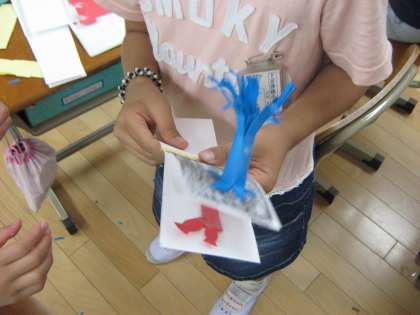 そこに色紙を貼り付けたり,絵を描いたりして,楽しい作品ができました。
