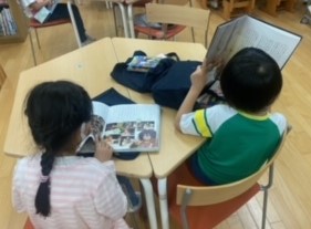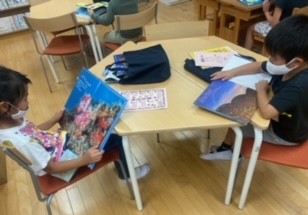 毎週金曜日はクラスみんなで図書室へ行きますが,他の曜日の休み時間にも図書室へ行く子が増えています。入学したての頃は知っているお話の絵本を見ている子が多い印象でしたが,この頃はいろいろなジャンルの本を手に取る子が増えています。本の借り方,返し方も覚え,図書館司書の大村先生にきちんと「この本を借ります!」「ありがとうございました」の挨拶もできています。