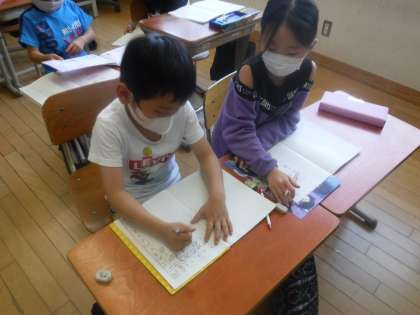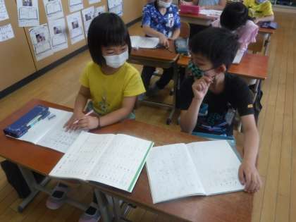 国語の教科書や他の教科の教科書などを見ながら,必死に同じ部分を持つ漢字を探す子どもたち。