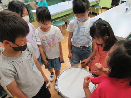 たくさんの楽器を触ったり鳴らしたりして,音が鳴っているときの楽器の様子で気づいたことを探しました。