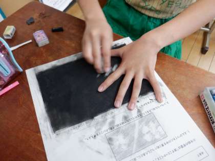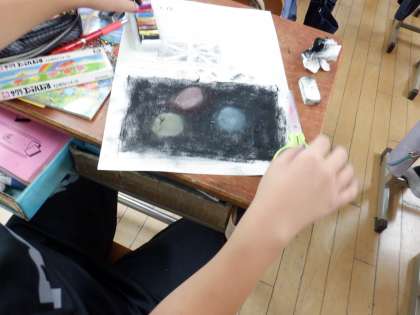 今日から「消してかく」の単元の学習に入っています。この単元ではコンテを使って,画面を塗りつぶし,消しゴムで消して作品を作ります。「消すこと=かくこと」となります。どんな線が消しゴムで描けるのかを試してみました。力の入れ加減や消しゴムの」使い方など,今日はそれぞれにいろいろな発見があったようです。作品の出来上がりが楽しみです!