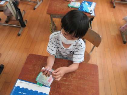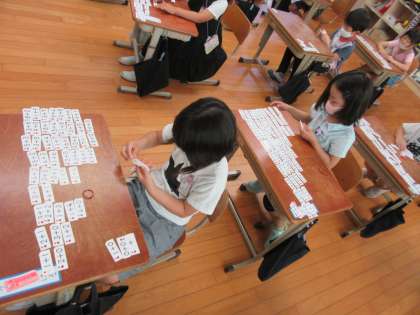 算数の学習で「たしざん1」の学習に入りました。今日はたしざんカードの答えを考えてなかま集めをしました。一つ一つのカードの答えを考えながら並べることができていました。