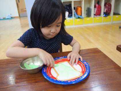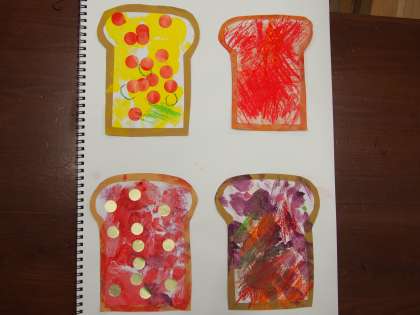 図工の学習では、トーストに絵具で作ったジャムを塗り、シールやクレパスで色を塗りました。おいしそうなトーストが焼き上がりました。