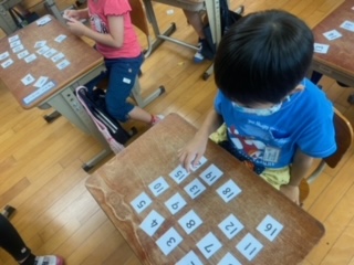 10より大きい数を学習しています。数字カードを使っていろんなゲームに取り組みながら,「10と8で・・・いくつ?」「10といくつで20・・?」学習を進めています。