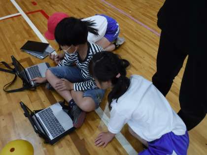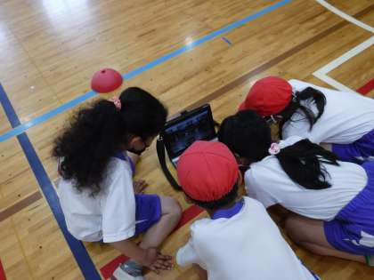 4年生の体育ではマット運動に取り組んでいます。端末で模範演技を見て,イメージをもちながら技に挑戦していました。