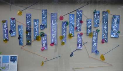 6月は,渉成レジデンスの安枝さんが作品を掲示してくださいました。金子みすゞさんの詩「星のかず」に合わせて掲示板を星空のように飾ってもらいました。4年生では理科で「星の明るさと色」の学習も始まります。今年は7月に天の川が見られるといいですね。
