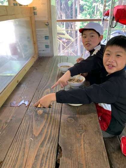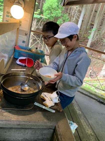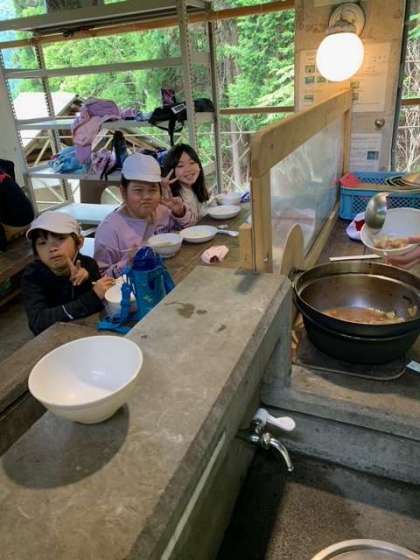 みんなで協力して炊事し、美味しいすき焼き風煮ができました。5年生の山の家の活動はどれもみんなの力で大成功でした!テーブルの水滴も5になっていてニッコリ。