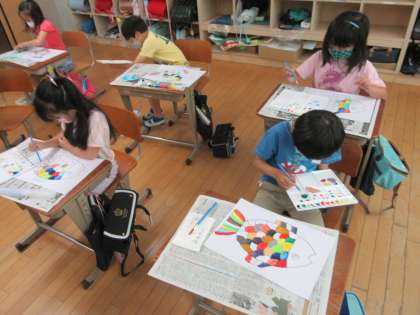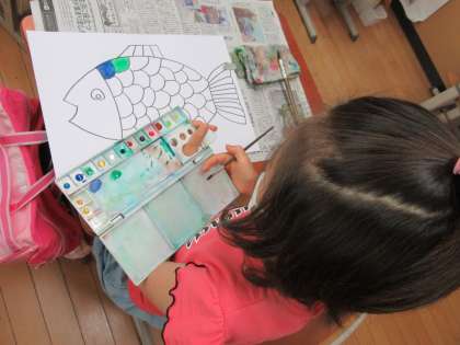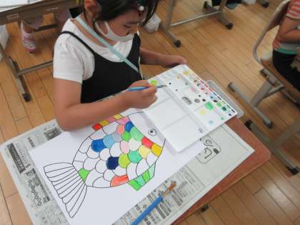図工の学習で初めて絵の具を使った学習をしました。子どもたちはとても楽しみにしていて,準備や塗り方などとても興味深い様子でした。パレットの色の出し方や筆洗での筆の洗い方に気を付けて,魚を色とりどりに塗りました。