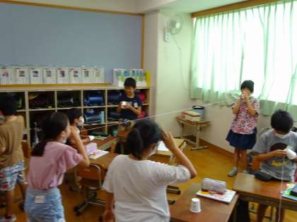その糸にスパンコールを付けてもう一度声を出してみると糸についたスパンコールが動く様子を見ることができました。音が伝わるときはその間にあるものも震えているんだということを学習することができました。