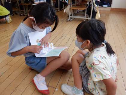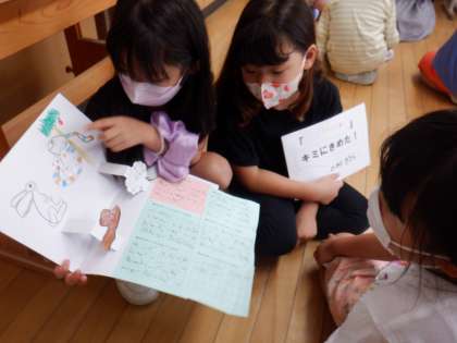 国語科のスイミーの学習で選んだレオレオニ作品を「キミにきめたブック」で1年生に紹介しました。キミにきめたブックは心に残った場面やその理由,あらすじ,考えた登場人物のセリフを書いたものです。一年生に紹介するために,これまでの国語の学習を頑張ってきたので,1年生に紹介を聞いてもらってとても嬉しそうでした。