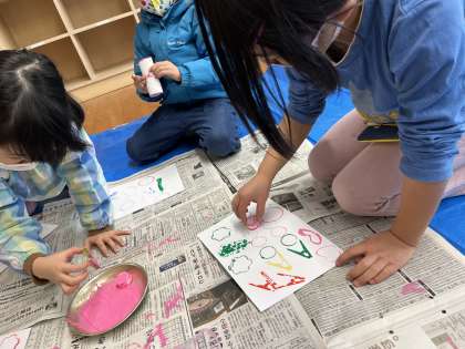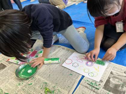 1年生の図工では、いろいろなものに色を塗り、形をうつして作品をつくっています。プリンのカップ、洗濯ばさみ、野菜など、おすといろいろな形がでてきます。どんどん押していくと、何かに見えてきました!とても楽しい作品が出来上がりました。