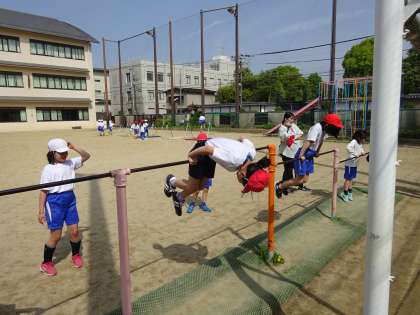 体育科の学習では、てつぼう運動を行なっています。さかあがりや後方支持回転、こうもりふりおりなど様々な技に挑戦しています。上がり技、回転技、おり技を組み合わせた連続技にもするなど意欲的に学習しています。