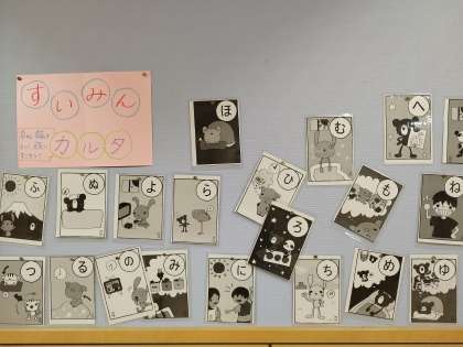 保健室前に「すいみんカルタ」を掲示しています。子ども同士で読み札を読み、札を探している姿も見られます。