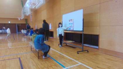 3年生は総合的な学習の時間で災害について学習してきました。今回は学習したことを2年生に向けて発信しました。今回は皆山消防分団の方々にも来ていただきアドバイスをいただきました。地震・台風・土砂災害など・・・様々な災害について伝えることができ、2年生の本間先生からは「学校の安全リーダーになってください」とお願いされました。