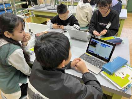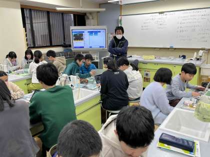 理科の学習では、マイクロビットと電気の利用実験ボードを使って、プログラミング体験をしました。プログラミングを通して、「電気を効率よく使うにはどうしたらよいか」を考えることができました。