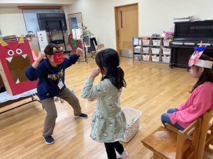 図工で作った鬼のお面をかぶって「鬼は外〜。福は内〜。」と鬼を退治しました。