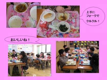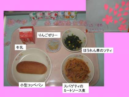 みんなが大好きな「スパゲティ」の献立で,全校で1年生の入学をお祝いしました。