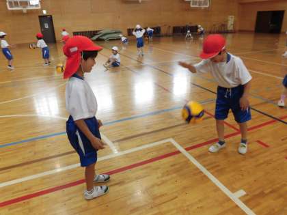 ようぐあそびでは、まず、ボールをついたり友達とキャッチしあって遊びました。