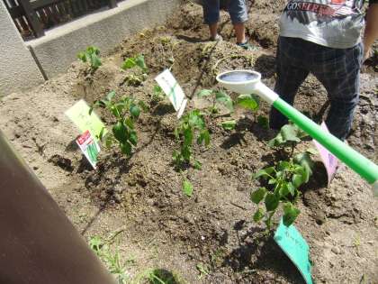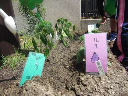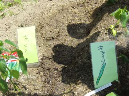 6月3日月曜日に,野菜の苗とオクラの種まきをしました。毎日水やりに行き,「大きくなってきたかなあ。」と,早く野菜が実るのを楽しみにしています。