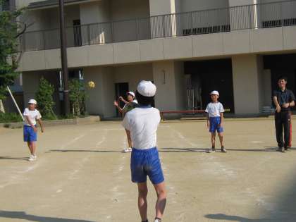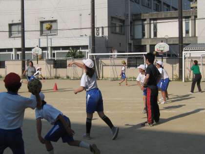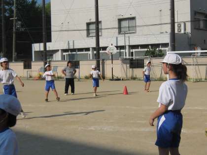 今日はメニューは「フラフープなどを使った体ほぐし運動から,ハンドボールに必要な足運びの運動を準備運動として行った後,パス・キャッチを楽しみました。