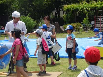 最後はみんなで屋外展示学習を楽しみました。アカハライモリを捕まえて掌に乗せて楽しんだり,ペットボトルボーリング,音の出る楽器遊びをしたりしました。
