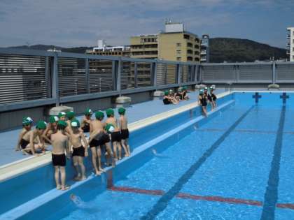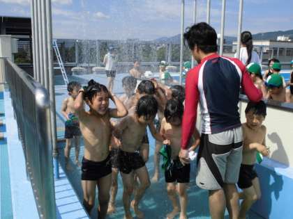 今年もプールが始まりました。本日の5時間目,1年生は初めてのプールでした。今日は,素早く着替えをして,授業の流れを確認したり,みんなで元気よく体操をしたり,水の中を歩いたりしました。「冷た〜い!」「気持ちがいいね。」と,大はしゃぎ!とっても嬉しそうでした。