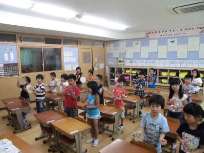 音楽科の学習で「たんとうんのりずむであそぼう」の学習をしてきました。色々なリズム打ちを練習し,たんとうんのリズムもとても上手に打つことができる1年生。今日はタンブリンやすず,カスタネットを使ってリズム打ちを楽しみました。楽器の音の重なりを楽しみながら演奏することができました。
