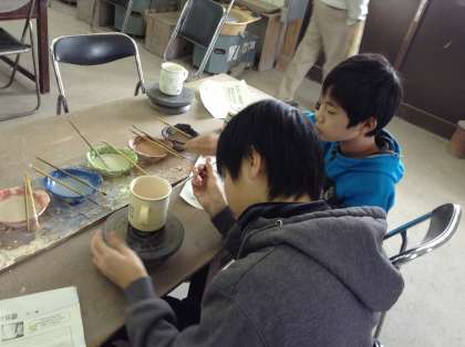 午前中は,「信楽陶苑たぬき村」でマグカップの絵付け体験をしました。