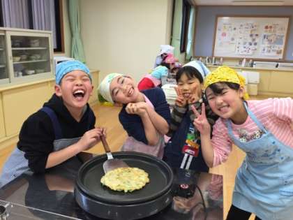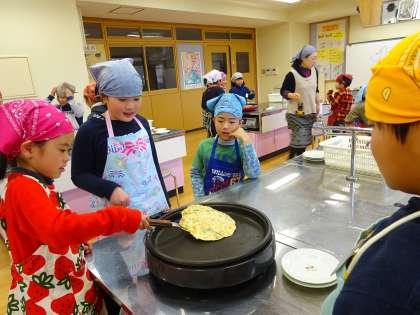 自分たちで育てて収穫したねぎを使って,栄養教諭の指導のもと「ねぎ焼き」を作りました。
