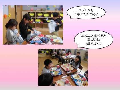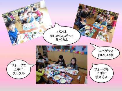 これからもみんなで仲良く楽しい雰囲気の中での会食をとおして,食事のマナーや感謝の心を育てていきます。