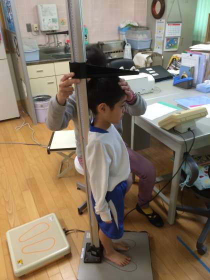 今日は身体計測です。体操服に着替えて身長と体重,座高を測ってもらいました。今年はどれだけ大きく成長するかな?これからの身体計測も楽しみです。