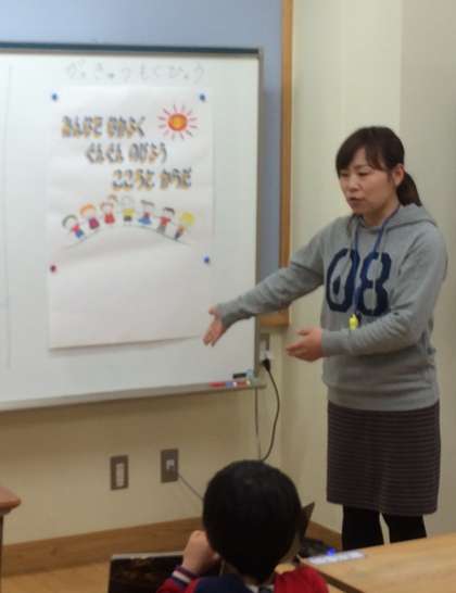 3組の時間です。今日はクラス目標の発表です。今年の3組のクラス目標は「みんなでなかよく ぐんぐんのびよう こころとからだ」です。みんなで仲良く,手を取り合っていろいろなことに挑戦しようという思いが込められています。今日から給食も始まりました。1年生も加わったので,高学年のお友達がエプロンの着方の見本を見せてくれました。今日は給食にチャレンジです。