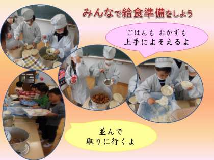 給食当番や係りの仕事を通して,みんなのために働く喜びや協力することの大切さを学びます。