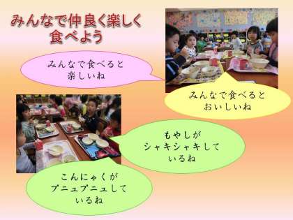 また,ごはん茶わんを持ったり,器に手を添えたりして食べるなど,食事のマナーも身につけていきます。