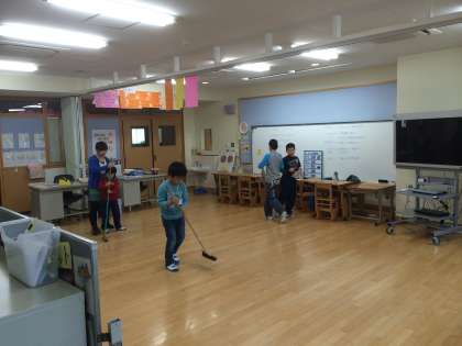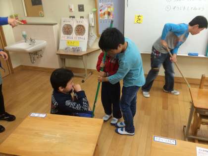 明日は3組の教室を掃除する日です。掃除の担当や掃除の仕方、道具の使い方を勉強しました。みんなで協力して、教室をピカピカにすることができました。