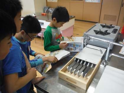 家庭科室には,どんなものがあるのだろう?5年生になり,初めて家庭科室に行きました。子どもたちは,教科書をもとに家庭科の調理実習に使う用具などを確かめました。フライパンに,包丁に,計量カップに・・・家庭科室には,たくさんの用具があるんですね。今から調理実習が楽しみです!!