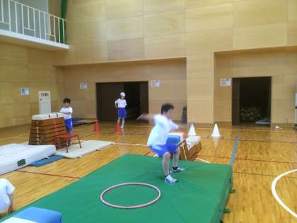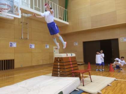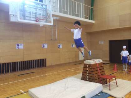 今日は3組の体育の時間がありました。今日は高く跳ぶことと,遠くに跳ぶことの練習をしました。とび箱の上からできるだけ高く跳び上がることを意識して,頑張ることができました。遠くに跳ぶ練習ではフラフープを置き着地を意識したり,横向きに回転して跳んだりして練習することができました。
