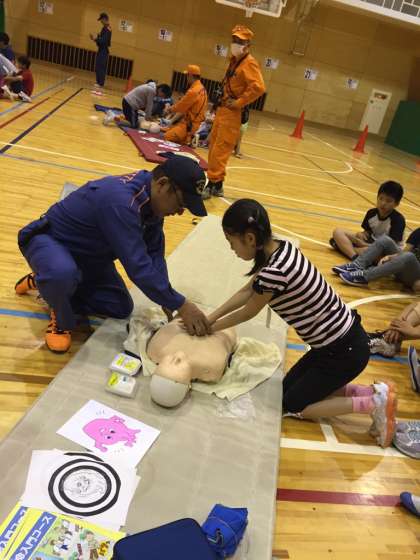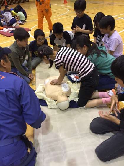 胸骨圧迫や人口呼吸など,人の命を救うために真剣に話を聞いていました。