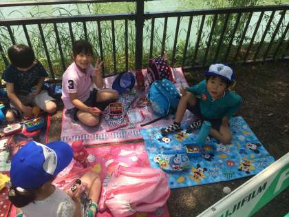 いっぱい動物を見てお腹もぺこぺこになりました。今日は遠足なのでお弁当です。みんなと敷物を並べて「いただきま〜す。」おいしくお弁当をいただきました。