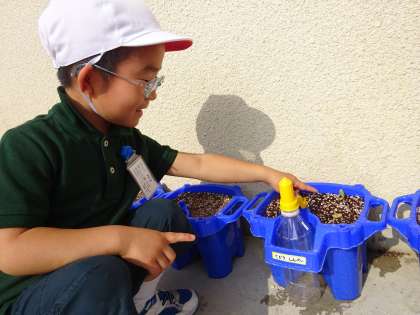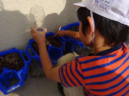 朝顔の種をまいてから,毎日,水をやりながら観察してきた子どもたち。