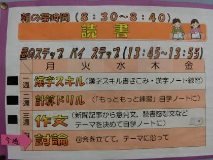 6年生のステップバイステップは,「漢字の練習」「計算」「作文」「討論」を1週ごとに設定し,掃除後の10分間,自分たちの力で学習を進められるようにしています。