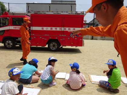 避難訓練のあと,消防署の方が消防車を見せてくださいました。
