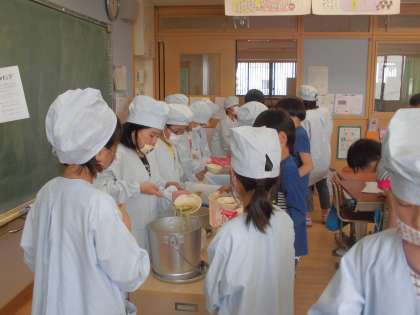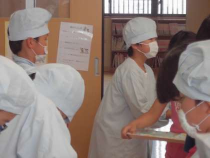 おいしい給食を食べるために当番で協力して配膳をします。