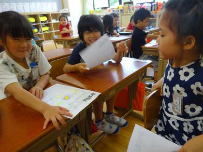 丁寧にカードをかき終えたあとは,友だちと交流しました。