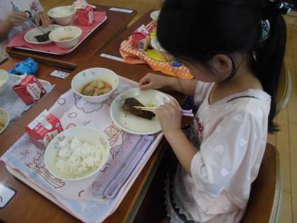 学んだことを生かして,給食の時間にさばの生姜煮を食べました。