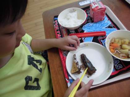 箸で小さくして,よく見て骨を除きます。