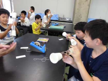 実験室学習では。「エコーマイク」を作りました。「あー」と話すとブルブルと震えたような声が出てみんな大喜びでした。
