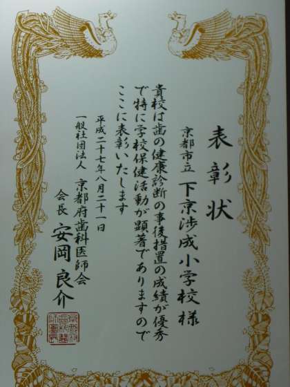 平成27年度の「学校歯科保健優良校」に選ばれました。表彰式が8月21日(金)に京都府歯科医師会館でありました。京都府下の小中学校から、特別表彰校13校と一般表彰校28校が表彰を受けました。本校は、特別表彰でした。学校表彰のほかに、児童生徒の絵画・ポスター・観察文の表彰もありました。