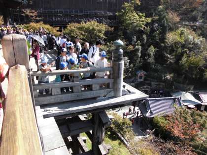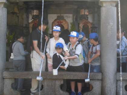 10月28日(水)清水寺へ探検に行ってきました。清水寺までの行き方は,総合の学習の時間に,高学年が調べてくれたバスと道順で行きました。自分たちで作ったしおりを手にして元気に探検へ出発しました。今回の探検の目的は,「清水寺には観光客の人たちがいっぱいいるのか?」「清水寺にはきれいな水があるのか?」を調べる事です。清水寺に行くにつれて,観光客の人たちや修学旅行で来ているお兄さんやお姉さんを見つけて「清水寺には観光に来ている人がたくさんいる!」とうれしそうに教えてくれました。次に,清水の舞台から京都の町をみました。「うわ〜きれい!」「ぼくの家見えるかな?」とみんなで舞台からの景色を楽しみました。そして最後に音羽の滝を見に行きました。階段から降りて音羽の滝を見つけると「きれいな水あった!」「ぼくらも並ぼう!」と大興奮のみんなでした。今回の探検の目的を達成し,大満足の3組でした。