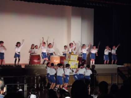 太鼓をたたいて元気よくお祭りの音楽を演奏しました。